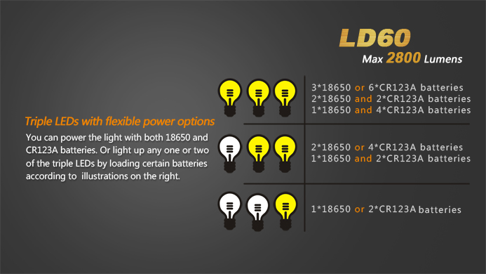 Sie haben nun folgende Möglichkeiten:Die Fenix LD60 Outdoor Taschenlampe bietet eine unübertroffene Leistung und Flexibilität mit drei Cree XM-L2 (U2) LEDs und 2800 Lumen. Mit dem breiten Lichtstrahl hat die Fenix LD60 einen sensationelle Ausleuchten. Die intelligente Schaltung der Fenix LD60 ermöglicht Ihnen auch einen Betrieb der Lampe wenn nur ein oder zwei oder drei Batterieschächte geladen sind. Diese Version der Fenix LD60 wird OHNE Batterien / Akku ausgeliefert.