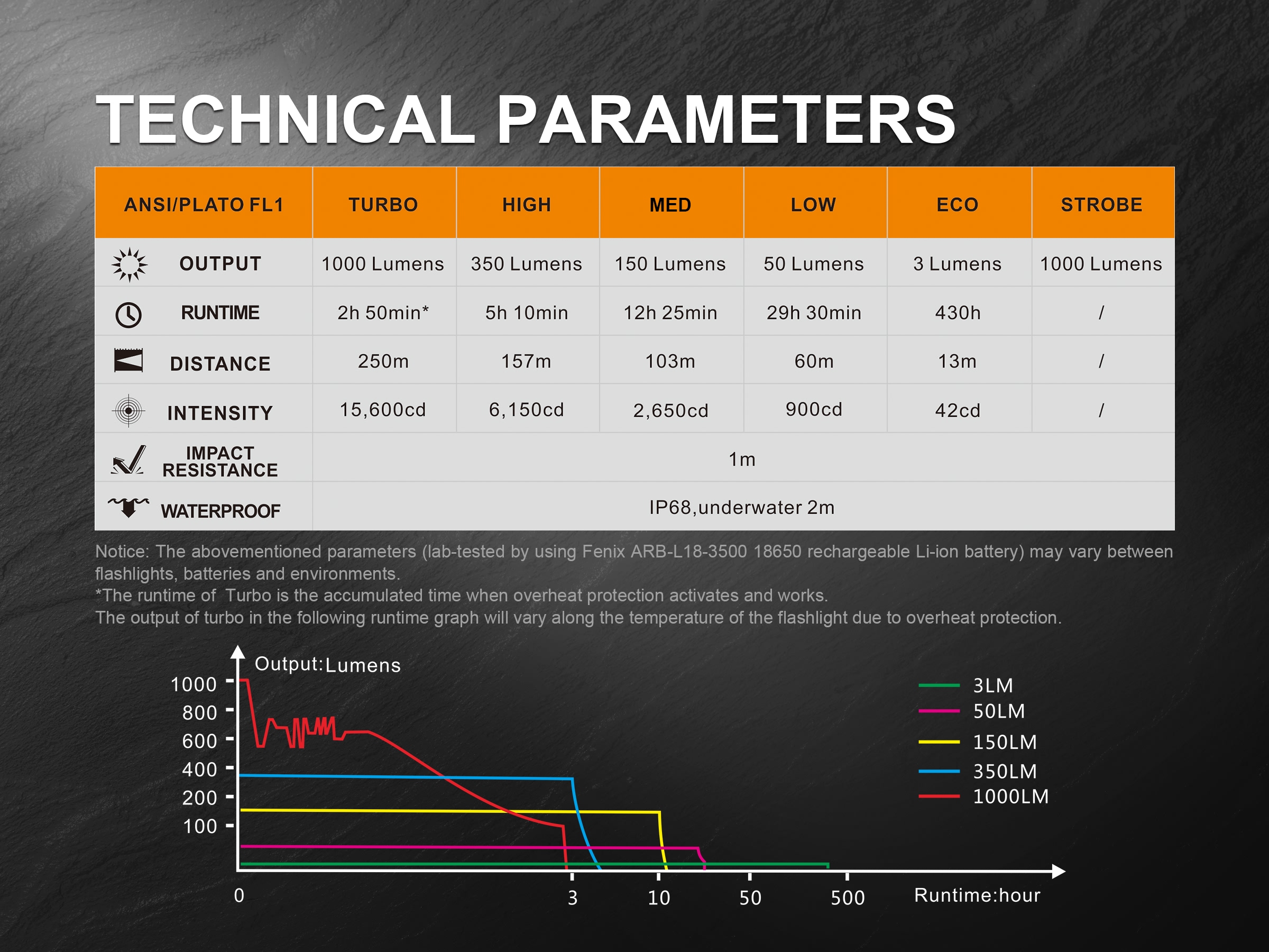 *Hinweis: Um die LED vor Überhitzung zu schützen wird die Lampe bei 65 Grad zurückgeschaltet. Die Lampe lässt sich jederzeit wieder in den Turbo schalten. Man sollte aber auf genügend Abkühlung achten. Die Leuchtzeit im "TURBO"-Mode ist ein errechneter, theoretischer Wert. Die zuvor genannten Werte wurden mit einem Fenix ARB-L18-3500 Akku im Labor ermittelt und können zwischen Taschenlampe, Batterien / Akkus und Umgebung abweichen.