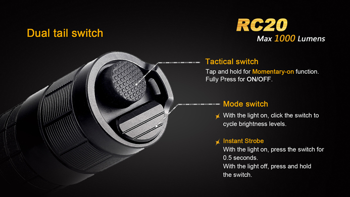 Sie haben nun folgende Möglichkeiten:Die Fenix RC20 ist eine wiederaufladbare Taschenlampe mit Ladestation. Die Ladestation kann man im Haus oder Büro an der Wand, oder PKW befestigen. So hat man die Fenix RC20 immer griffbereit und voll aufgeladen einsatzbereit. Mit der Cree XM-L2(U2) LED erreicht die Fenix RC20 1000 Lumen und 290 Meter Leuchtweite. Die Fenix RC20 wird mit einem ARB-L1 LiIon Akku mit 2.600mAh betrieben. Mit dem Dual-Endschalter kann man vier Helligeitstufen und Strobo schalten.