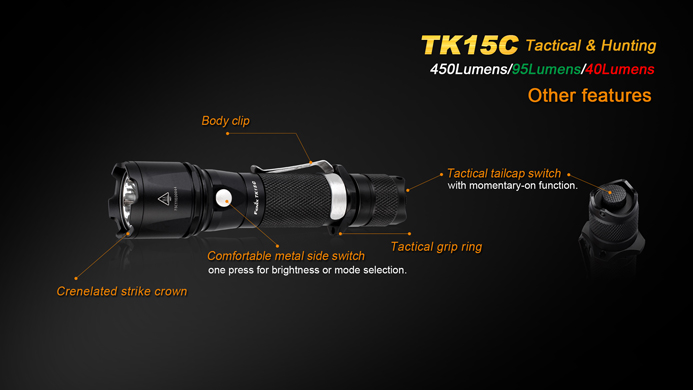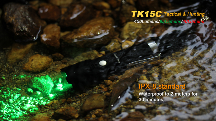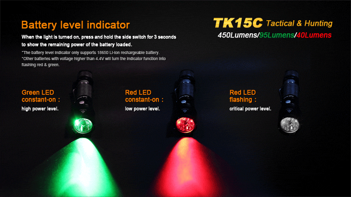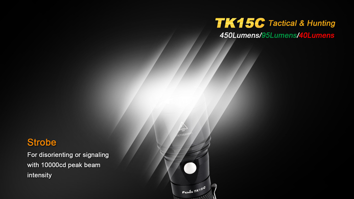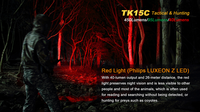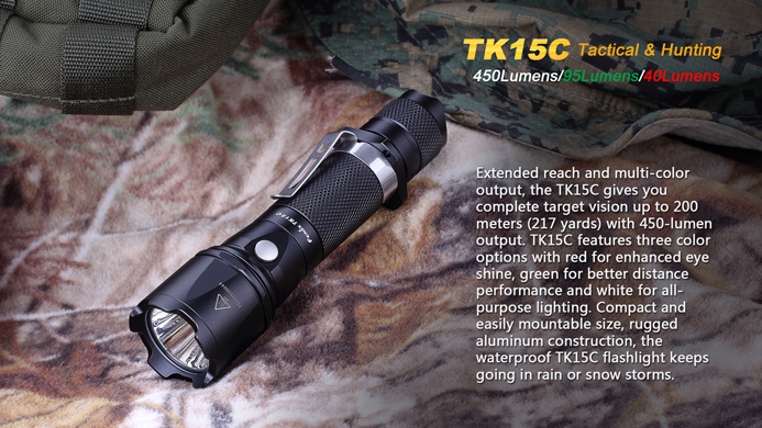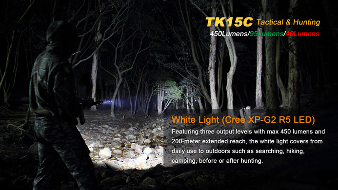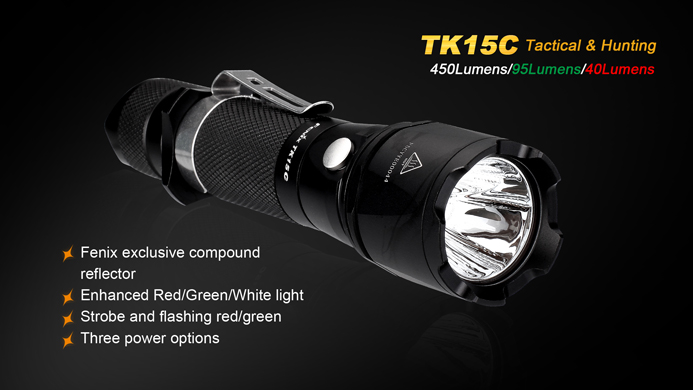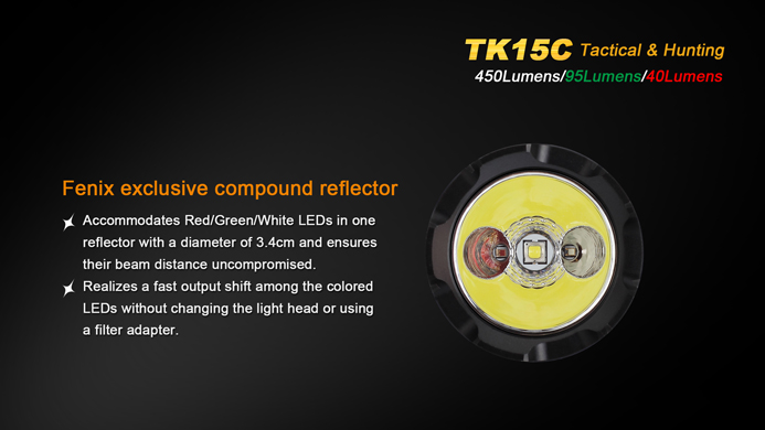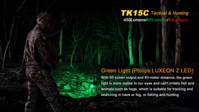 Sie haben nun folgende Möglichkeiten:Die Fenix TK15C ist mit ihren unterschiedlichen LEDs eine besonders vielseitige Taschenlampe. Die weiße LED bietet eine sehr gute Ausleuchtung. Die rote LED erhält die Nachsichtigkeit und vermindert die Anziehung von Insekten. Die grüne und die rote LED wir von vielen Tiere nicht wahrgenommen und ist desahlt besonders zu Beobachtung und Jagt geeignet.Diese Version der Fenix TK15C wird OHNE Batterien / Akku ausgeliefert.