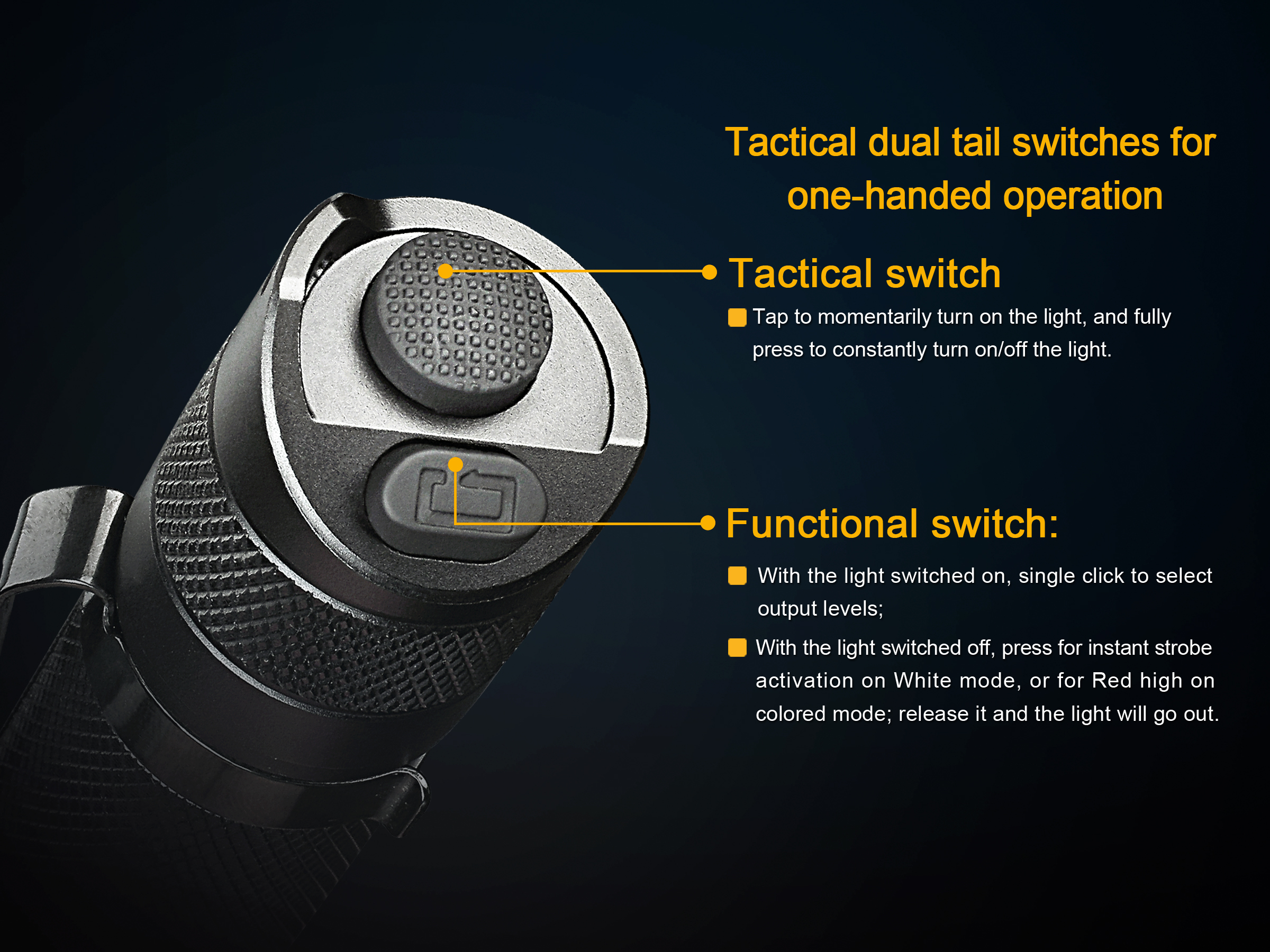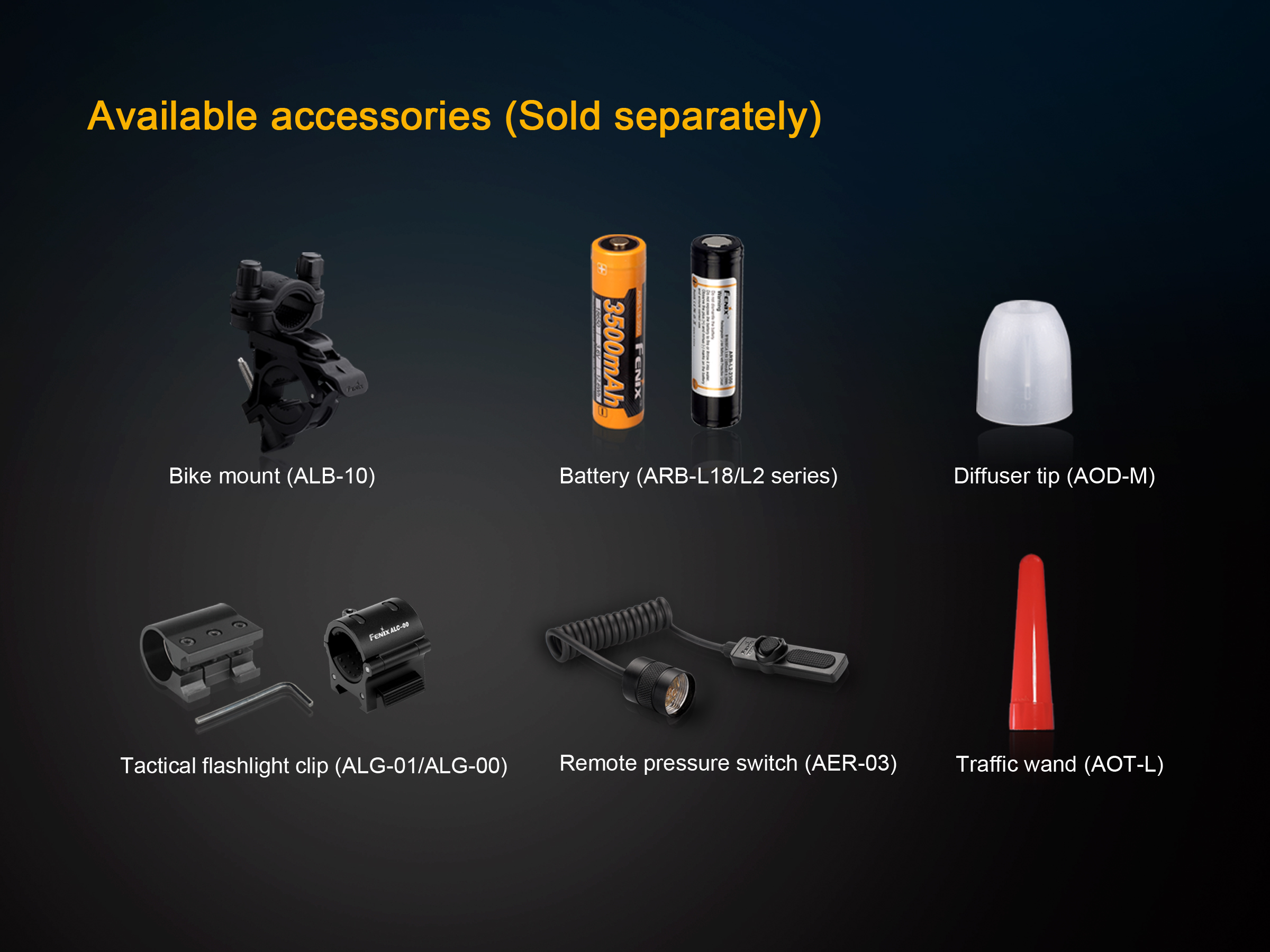 Hinweis: Die zuvor genannten Werte wurden im Labor unter der Verwendung von zwei Fenix ARB-L18-3500 - 18650 LiIon Akkus mit 3500mAh ermittelt und können zwischen Taschenlampe, Batterien / Akkus und Umgebung abweichen.