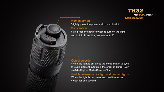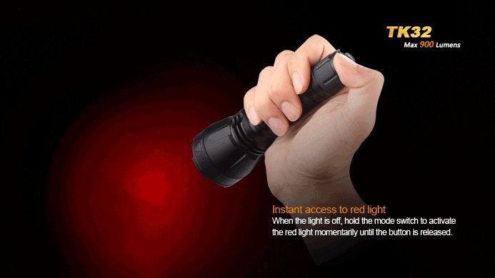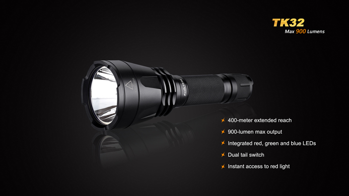 Sie haben nun folgende Möglichkeiten:Dank des großen Reflektors und der Cree XM-L2 U2 LED erreicht die Fenix TK32 Taschenlampe mit nur einem 18650 Akku eine Leuchtweite von 400 Meter und 900 Lumen Lichtleistung. Die Fenix TK32 ist neben der Haupt-LED mit einer roten, grünen und blauen LED ausgestattet. Mit dem zwei Heckschaltern der Fenix TK32 können Sie schnell zwischen den verschiedenen Modi hin und her schalten. Diese Version der Fenix TK32 wird mit 2 CR123A Batterien ausgeliefert.