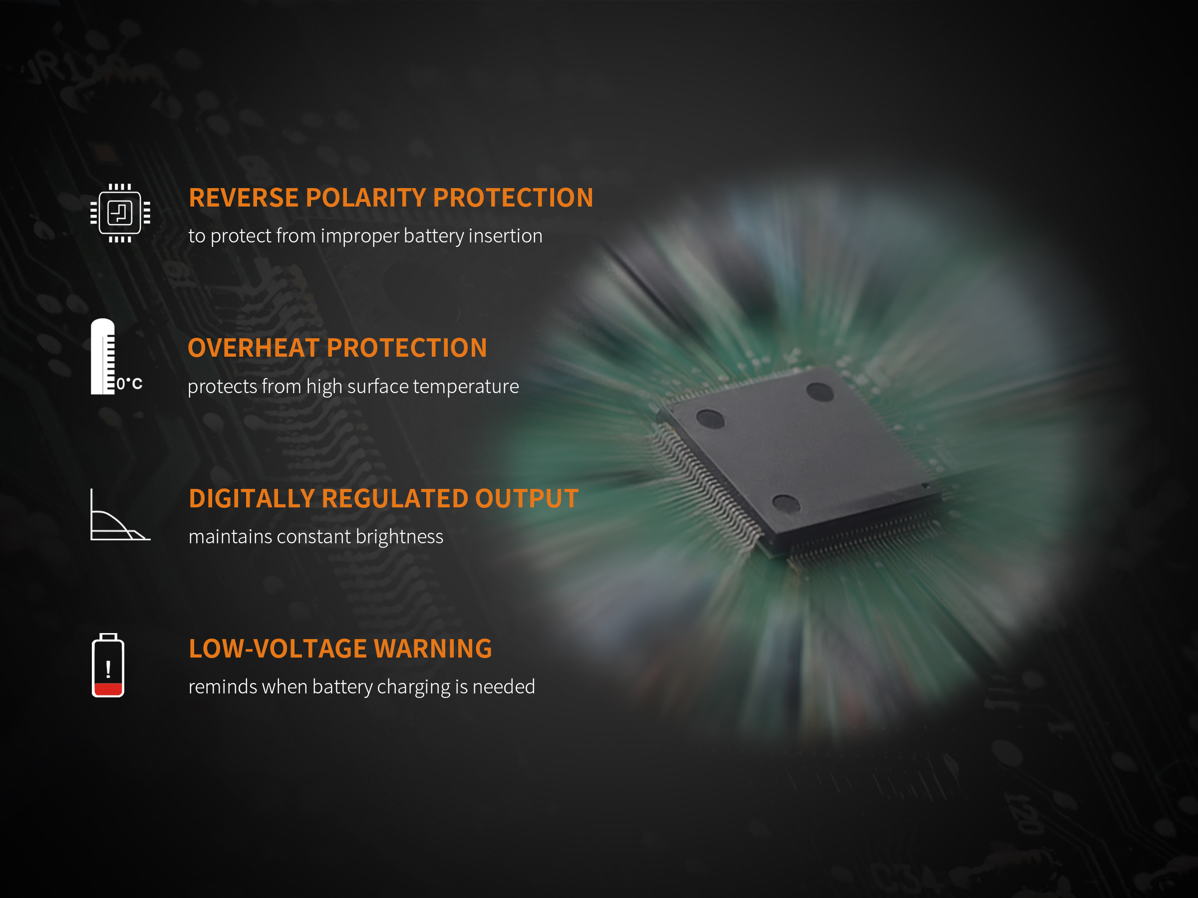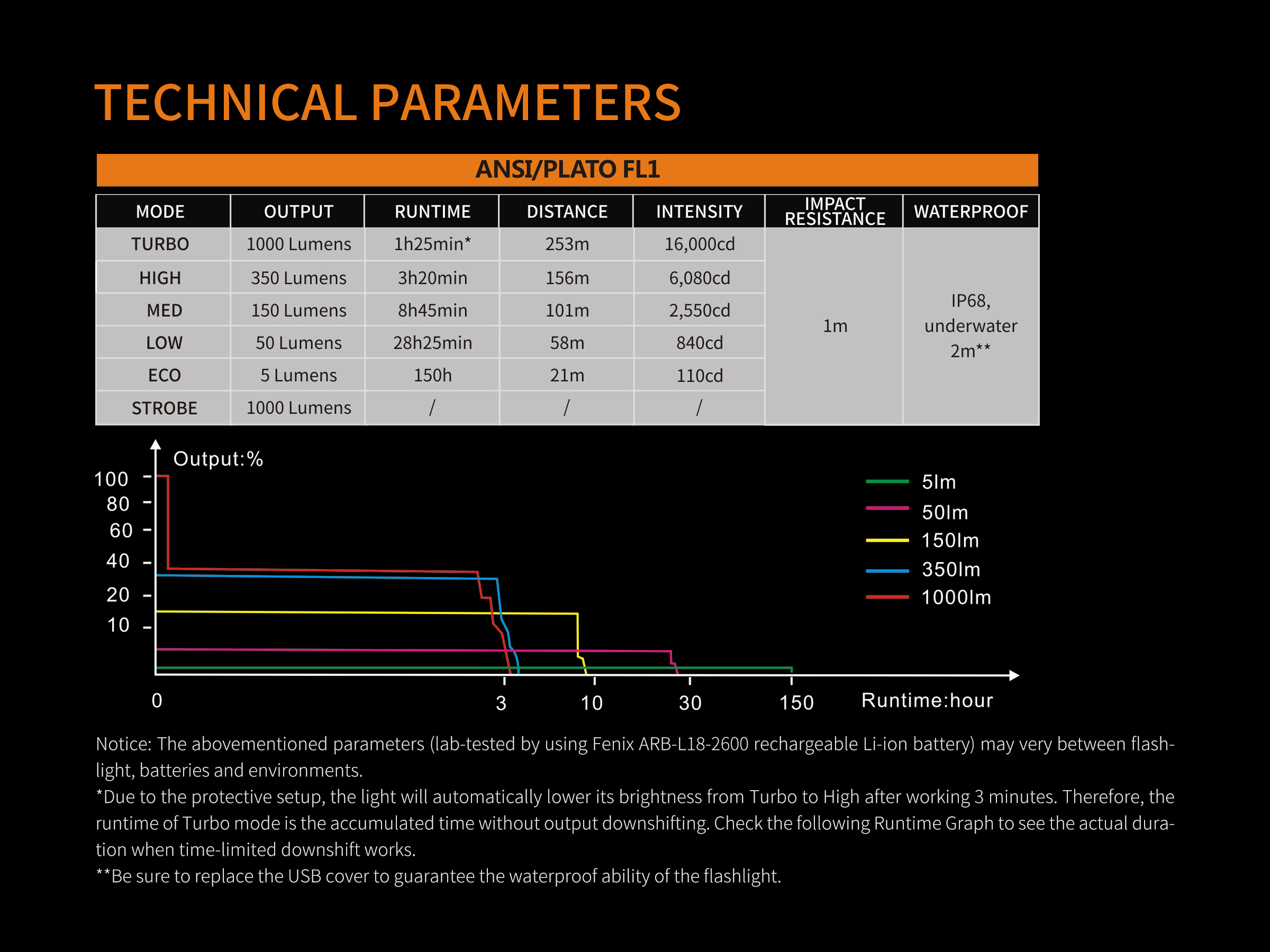 *Hinweis: Um die LED vor Überhitzung zu schützen wird die Lampe nach 3 min von Turbo auf High zurückgeschaltet. Die Lampe lässt sich jederzeit wider in den Turbo schalten. Man sollte aber auf genügend Abkühlung achten. Die Leuchtzeit im "TURBO"-Mode ist ein errechneter, theoretischer Wert. Die zuvor genannten Werte wurden mit einem Fenix ARB-L18-3500 Akku im Labor ermittelt und können zwischen Taschenlampe, Batterien / Akkus und Umgebung abweichen.