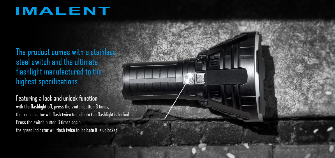 Sie haben nun folgende Möglichkeiten:Die Imalent R90C erreicht mit ihren neun CREE XHP35 HI LEDs eine Helligkeit von 20000 Lumen und eine extreme Leuchtweite von 1679 Meter. Die Imalent R90C ist der ideale Thrower wenn es um eine große Leuchtweite geht. Die Imalent R90C wird mit einem speziell angefertigten Akkupack betrieben, der innerhalb von 2 Stunden und 25 Minuten mit dem integrierten Ladegerät, vollständig aufgeladen werden kann. Die sieben Leuchtstufen und das Strobe werden mit dem Seitenschalter über eine einfache Einhandbedienung bedient. Das Gehäuse der Imalent R90C besteht aus HAIII anodisierten Luftfahrt-Aluminium und ist schlagbeständig und wasserdicht. Die Imalent R90C ist die ideale Lampe Such.- und Rettungsmannschaften, Feuerwehr, Polizei, Wachschutz, Sicherheitspersonal und für alle Outdoorabenteuer.