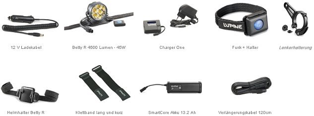 Die Lupine Betty R 14 kommt mit einem 13.2 Ah SmartCore Akku, Helmhalter und 25.4mm Lenkerhalterung sind im Lieferumfang. Weitere Befestigungsmöglichkeiten sind optional erhältlich.