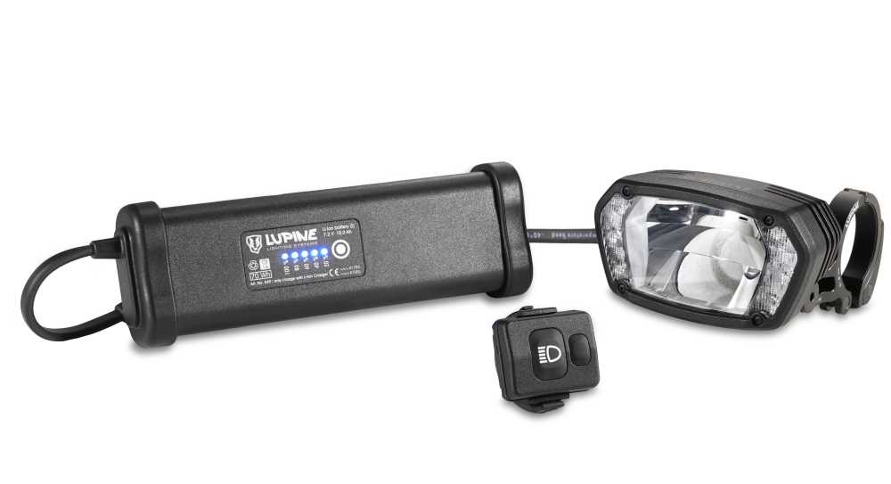 Du schaltest auf Fernlicht, die Lupine SL AX 10 öffnet einen taghellen Korridor weit oberhalb der blendfreien Hell-Dunkel-Grenze und befeuert die 9 Automotive LEDs des Hauptscheinwerfers auf das Maximum. Einzigartig hierbei: Gleichzeitig schaltet sich das Tagfahrlicht mit deutlich erhöhter Leistung hinzu. Seine 6 LEDs und das ausgeklügelte Fresnel-Linsensystem erhöhen die Lichtleistung und schaffen eine zusätzliche Nahausleuchtung mit der du schnelle Abfahrten und technische Wurzelpassagen spielerisch meisterst. Der Helligkeitssensor der Lupine SL AX 10 erkennt Dunkelheit und schaltet automatisch vom Tagfahrlicht ins Abblendlicht, gleichzeitig gibt er das Fernlicht frei. Dieses hat eine Reichweite von bis zu 370m und sorgt für beste Sicht abseits der Stadt und auf Trails. Ist das Abblendlicht aktiv, kann mit der Bluetooth Fernbedienung ins Fernlicht und wieder zurück gewechselt werden. Mit Hilfe des Peppi Halters wird sie sicher neben dem Lenkergriff angebracht. Der Lampenkopf wird mit dem Schnellspanner aus CNC-gefrästem Aluminium neben dem Vorbau montiert, der Akku mit Hilfe eines rutschfesten Klettbandes am Rahmen des Fahrrads. Die Akkus verfügen über eine Kapazitätsanzeige (SmartCore) und haben je nach gewähltem Modell eine maximale Laufzeit von bis zu 20h (6.9Ah) bzw. 28h (10.0Ah).