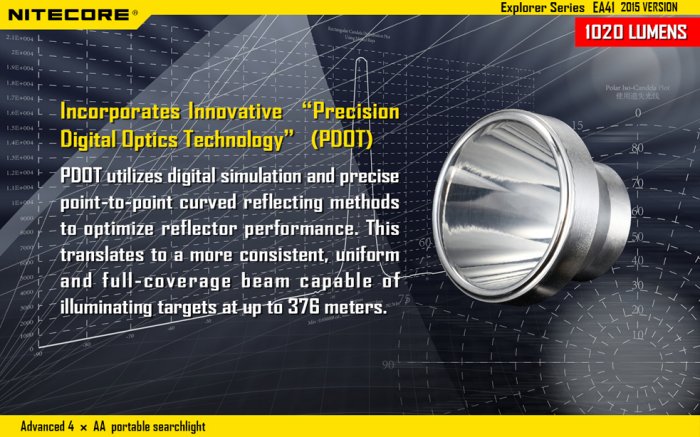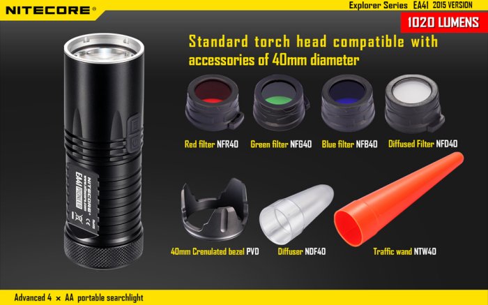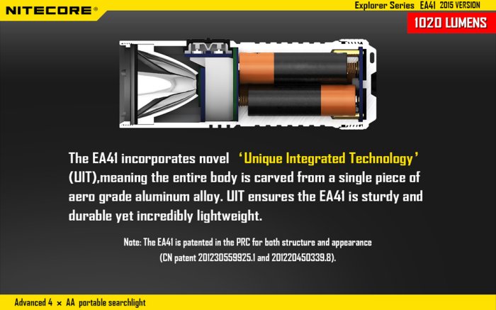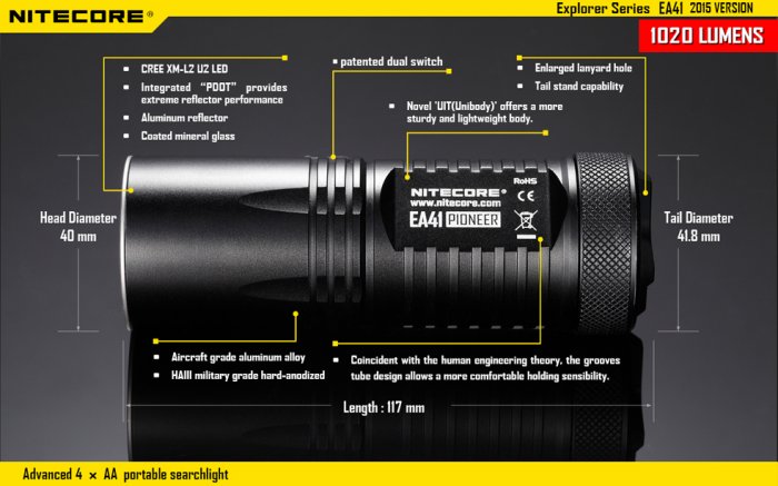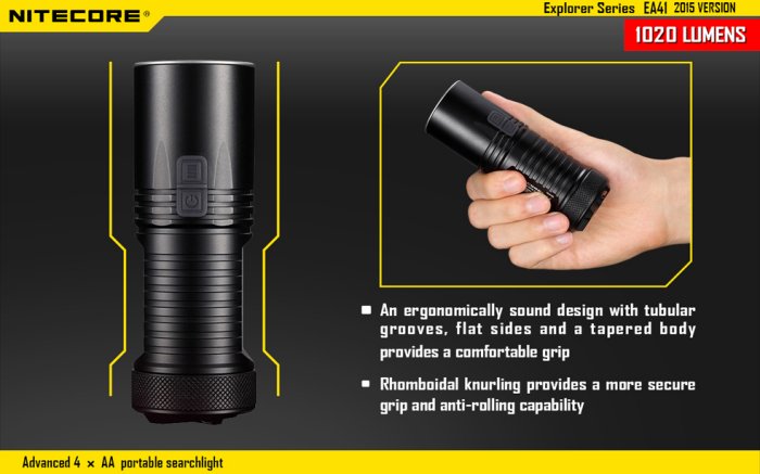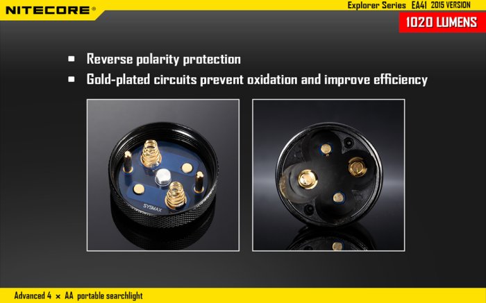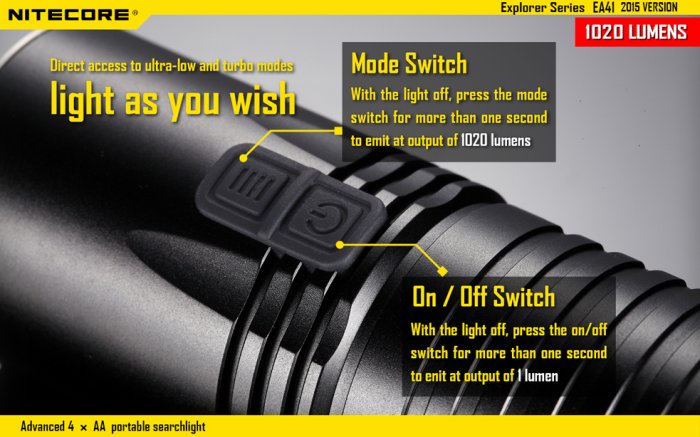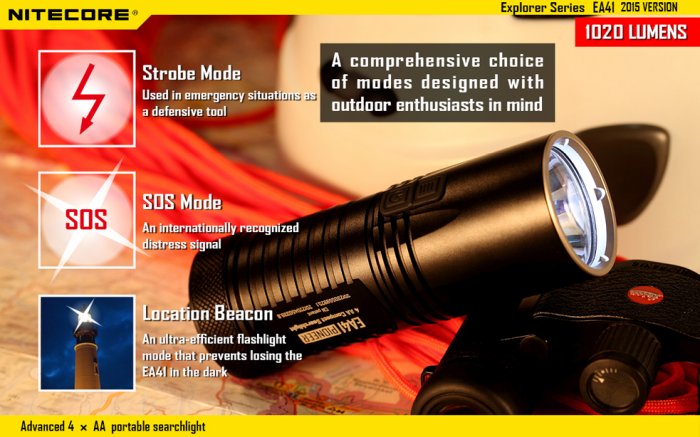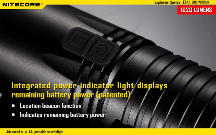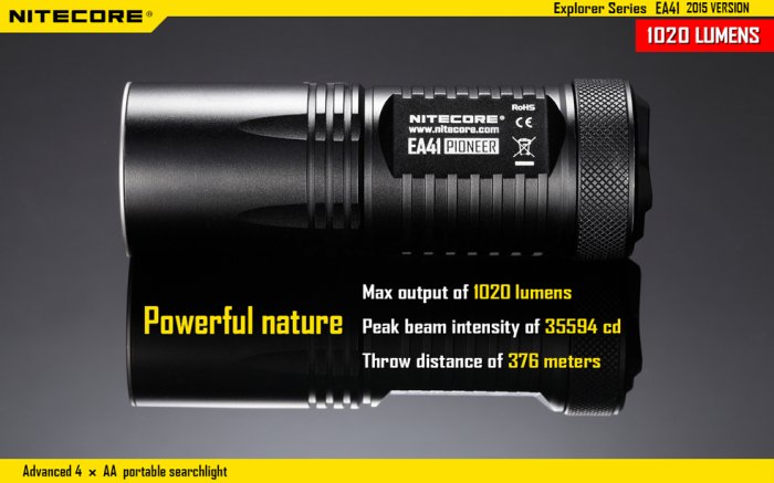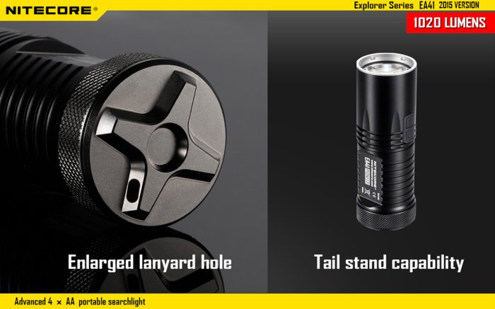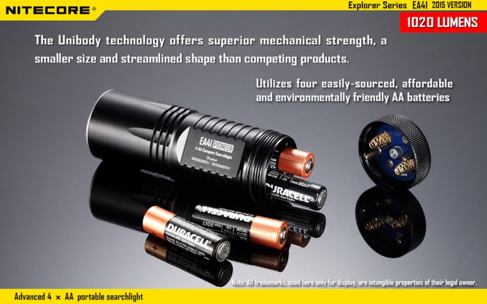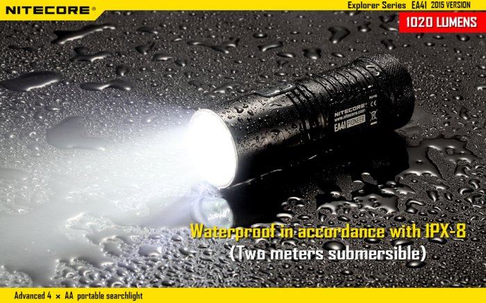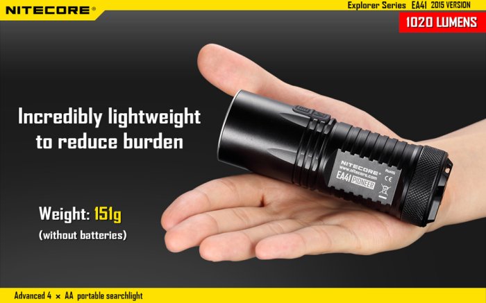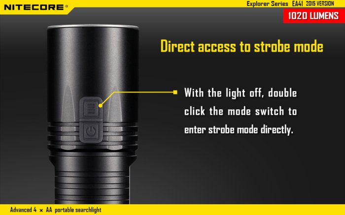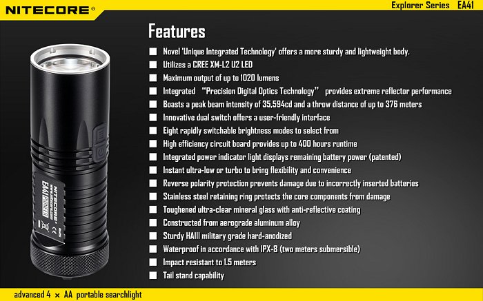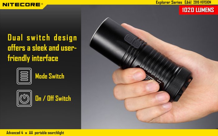 Sie haben nun folgende Möglichkeiten:Die Nitecore EA41 ist eine LED Taschenlampe mit 1020 Lumen im ANSI/NEMA FL-1 Standard. Mit vier AA Batterien erreicht die Nitecore EA41 eine Laufzeit von bis zu 400 Stunden. Die LED Lampen der Explorer Serie verfügen über eine Batteriestandanzeige mit Notlichtfunktion. Durch die einfache Knopfbedienung am Lampenkopf der Nitecore EA41 kann man in die verschiedenen Modi schalten. Das Gehäuse der Nitecore EA41 besteht aus HAIII anodisierten Luftfahrt-Aluminium und ist Spritzwassergeschützt nach IPX-8. Die Nitecore EA41 mit cool white LED hat eine besser Durchdringung bei Nebel und hoher Luftfeuchtigkeit.