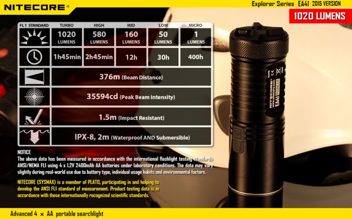 Nitecore gehört der PLATO (Portable Lights American Trade Organization) an und die Lichtleistung der Lampe werden im ANSI/NEMA-FL-1 Standard gemessen. Dieser Standard erlaubt es die wirklich gemessene Lumen der Lampe mit anderen zu vergleichen. Gemessen und auf Verpackungen angegeben werden nach diesem Standard: