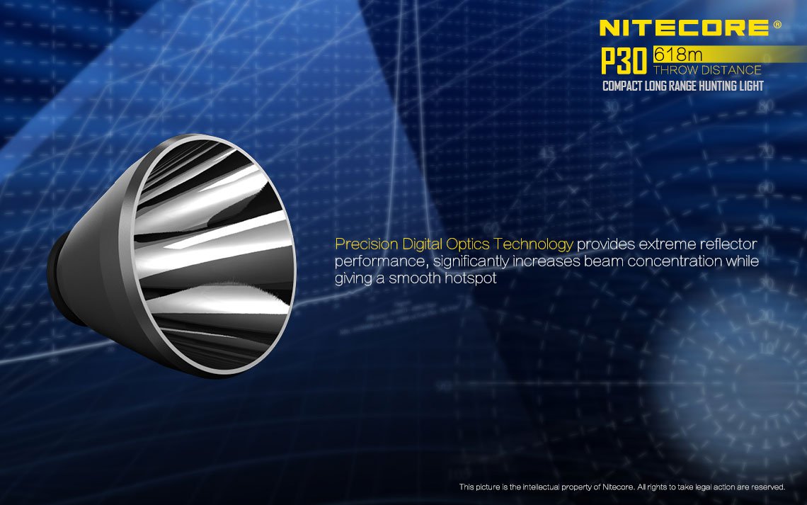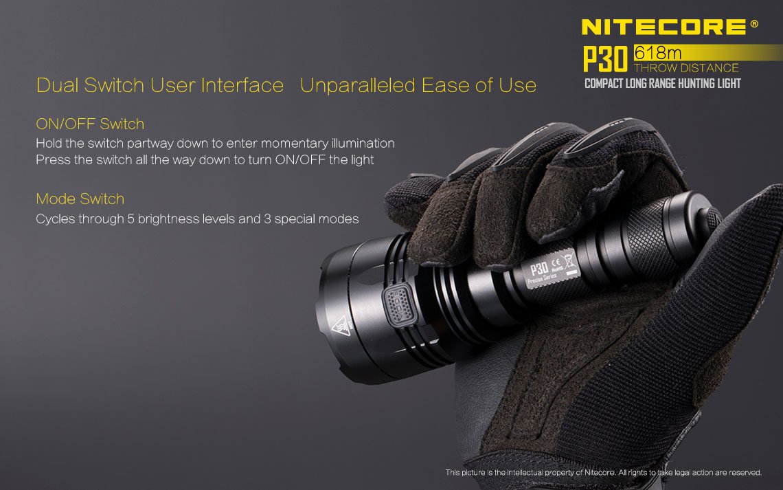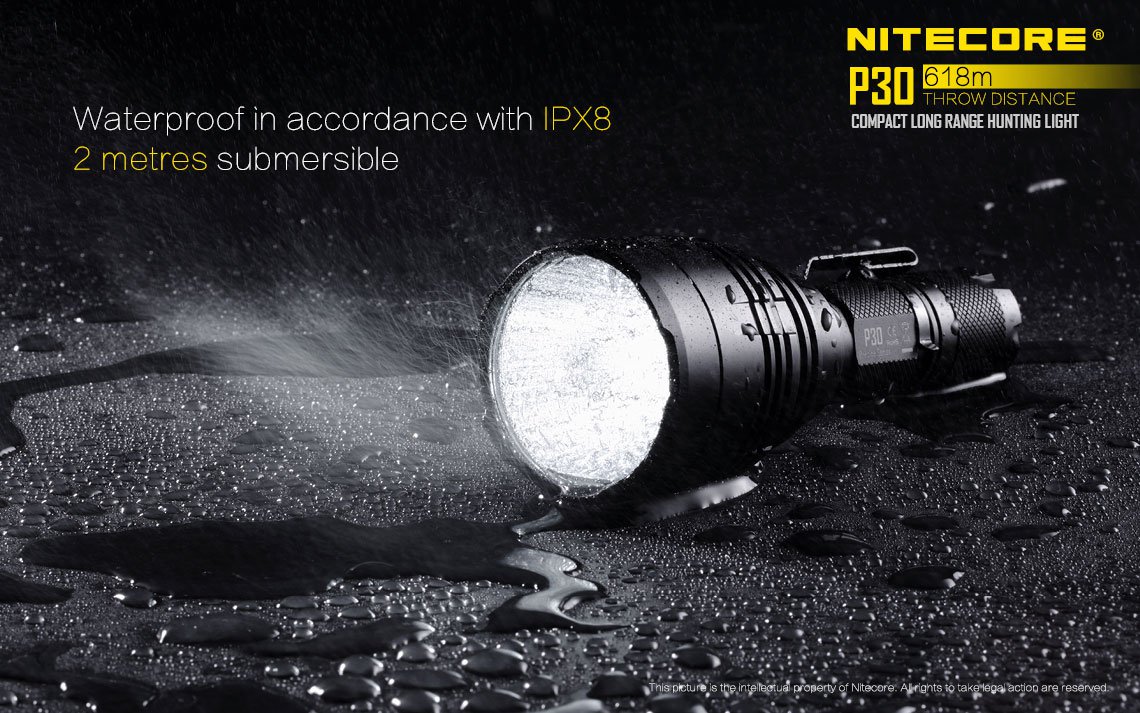 Sie haben nun folgende Möglichkeiten:Die Nitecore P30 ist eine LED Taschenlampe die mit ihrem großen Reflektor auf extreme Leuchtweite getrimmt ist. Mit der CREE XP-L HI V3 erreicht die Nitecore P30 1000 Lumen Lichtleistung und 619 Meter Leuchtweite! Mit einem 18650 Li-Ion Akku mit 3400mAh hat die Nitecore P30 eine Laufzeit von bis zu 680 Stunden. Die Nitecore P30 verfügt über zwei Schalter für den schnellen Zugriff auf die fünf Leuchtstufen und die drei Sondermodi (SOS, Strobe, Beacon). Die LED Lampe zeigt den Akkustand auf 0,1V genau an. Das Gehäuse der Nitecore P30 besteht aus HAIII anodisierten Luftfahrt-Aluminium und ist Spritzwassergeschützt nach IPX-8.