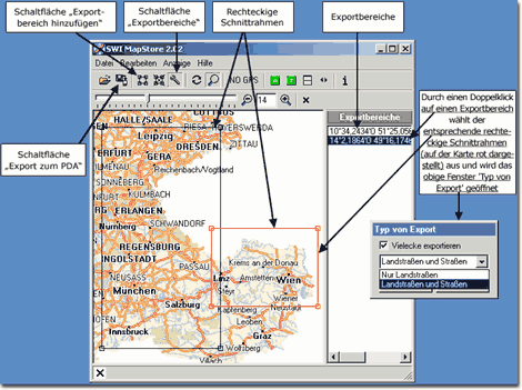 | MapStore 2.0 Zum Lieferumfang von MapSonic für Palm OS gehört die Kartenbibliothek-Software MapStore, mit der Sie den oder die gewünschten Kartenausschnitt/e zunächst auf Ihrem PC aussuchen und anschließend auf Ihren Palm übertragen können. Mit MapStore lässt sich das betreffende Gebiet optimal und präzise nutzen: So können Sie beispielsweise die Zahl der in den ausgewählten Karten anzuzeigenden Details festlegen. Schließlich noch sei darauf hingewiesen, dass MapStore für PC seinerseits sämtliche Funktionalitäten von MapSonic für Palm bietet (Suchmaschine, Routenberechnung, GPS-Funktion mit Sprachausgabe, Reiserouten, personalisierbare POIs usw.). |