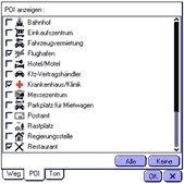 POIs Mit MapSonic finden Sie rasch eine Vielzahl an nach Kategorien geordneten POIs (Points of Interest = Orte und Einrichtungen von besonderem Interesse): Rastplätze, Flughäfen, Postämter, Verbrauchermärkte, Autovermietungen, Bahnhöfe, Hotels, Restaurants, Parkplätze, Stadien, Tankstellen und vieles mehr? MapSonic gestattet Ihnen darüber hinaus, Orte, die Sie besonders interessieren, durch personalisierte POIs zu ergänzen! |