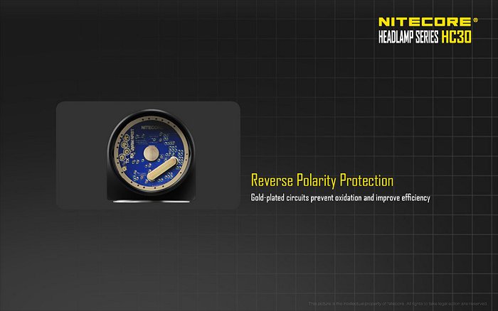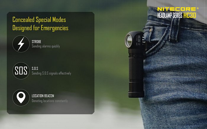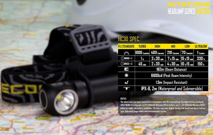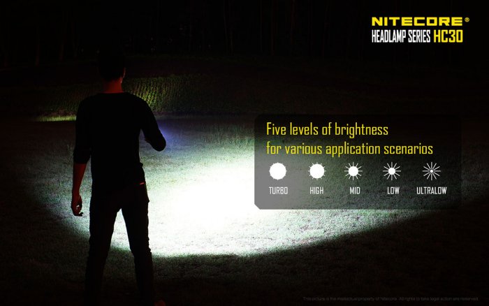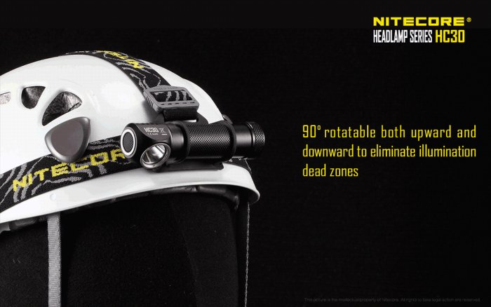 Die Nitecore HC30 ist eine LED Stirnlampe mit 1000 Lumen im ANSI/NEMA FL-1 Standard. Die CREE XM-L2 U2 LED lässt sich in fünf Stufen in der Helligkeit regulieren. Die Winkellampe läßt sich mit dem Clip auch an einer Jackentasche oder ähnlichem befestigen. Die Nitecore HC30 kann man mit zwei CR123A Batterien oder einen 18650 Akkus betrieben werden und erreicht eine Laufzeit von bis zu 330 Stunden. Die Nitecore HC30 verfügt über eine ATR-Temperaturregelung. Dies verhindert Schäden durch Überhitzung und verlängert die Lebensdauer der Nitecore HC30.