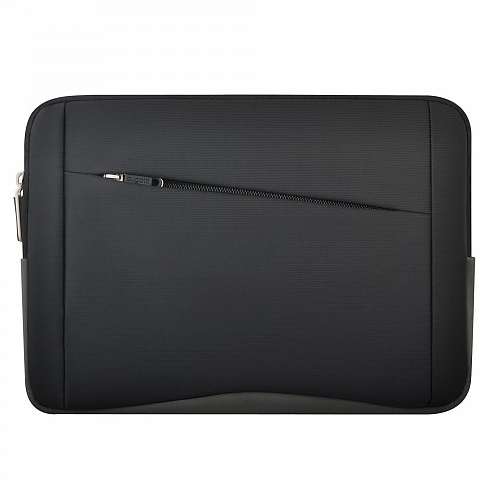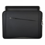 Das Tablet Case ist zweifarbig: hauptsächlich schlicht schwarz und am unteren Rand ist der graue Stoff in Velourlederoptik ein schönes Detail. Denselben Grauton hat auch das weiche, glatte Innenfutter, das beanspruchte Touchscreens schützt. Das Case wird mit einem halb umlaufenden Reißverschluss sicher verschlossen. Vorne bietet eine praktische Reißverschlusstasche mit verstecktem silber-schwarzen Reißverschluss Platz für Kabel, Kopfhörer oder Karten. Der dezente bugatti-Schriftzug ziert die Reißverschlusszipper.