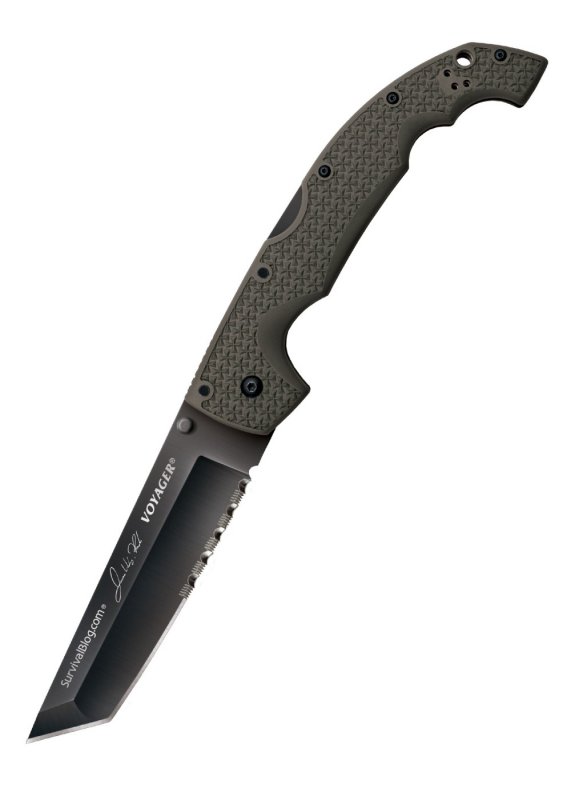 Das Cold Steel Rawles Voyager XL Tanto 50/50 wurde präzise nach den Vorgaben von James gestaltet. Es verfügt über Griv-Ex-Griffschalen in der Farbe O.D. green (olivgrün), Platinen aus gehärtetem Aluminium 6061 und Cold Steels berühmte Tri-Ad-Arretierung, die in puncto Schlag- und Stoßfestigkeit ihresgleichen sucht und für noch bessere Widerstandsfähigkeit im Gelände sorgt.