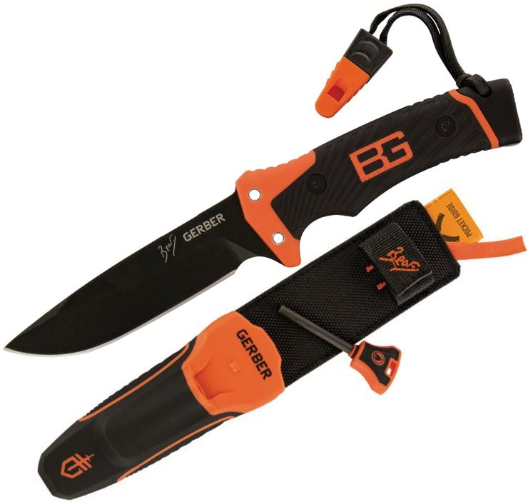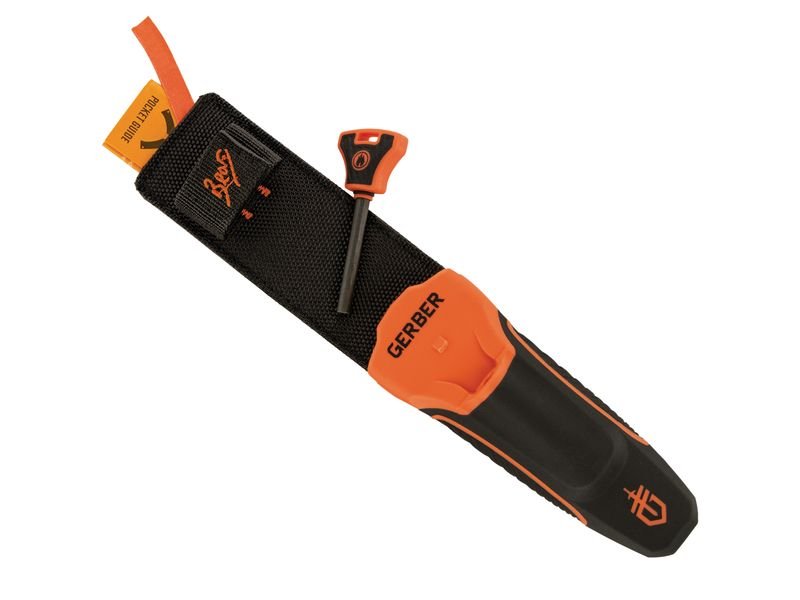 Sie haben nun folgende Möglichkeiten:Das Bear Grylls Ultimate Pro ist ein Survivalmesser mit feststehender Klinge, das Gerber zusammen mit dem Survival-Spezialisten Edward Grylls entwickelte. Die 5mm starke Klinge besteht aus rostfreiem 9Cr19MoV Stahl, die mit einer schützenden Beschichtung versehen ist. Der mit rutschhemmenden TPE Material bestückte Griff des Bear Grylls Ultimate Pro hat am Ende eine Hammerfläche aus rostfreiem Stahl. Mehrere Griffbohrungen ermöglichen die vielseitige Befestigung und Sicherung des Messers. Sehr nützliches Zubehör wird in Form eines Feuerstarters, eines Schärfsteins einer Signalpfeife mitgeliefert. Für die Unterbringung von Messer und Survival-Zubehör wird eine variabel zu befestigende Scheide aus einer Nylon-/Kunststoffkombination mitgeliefert.