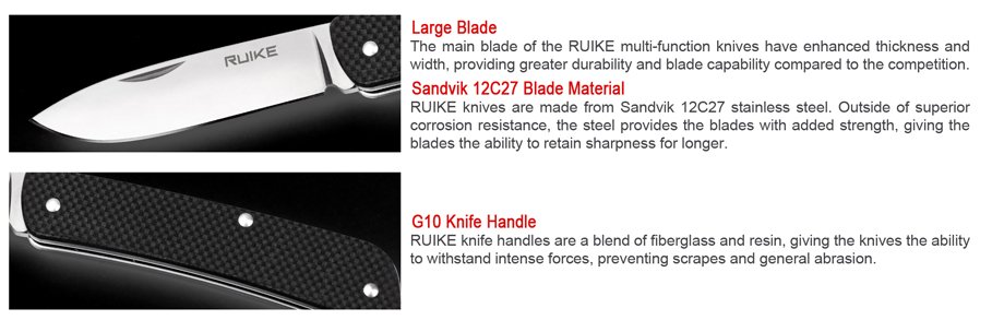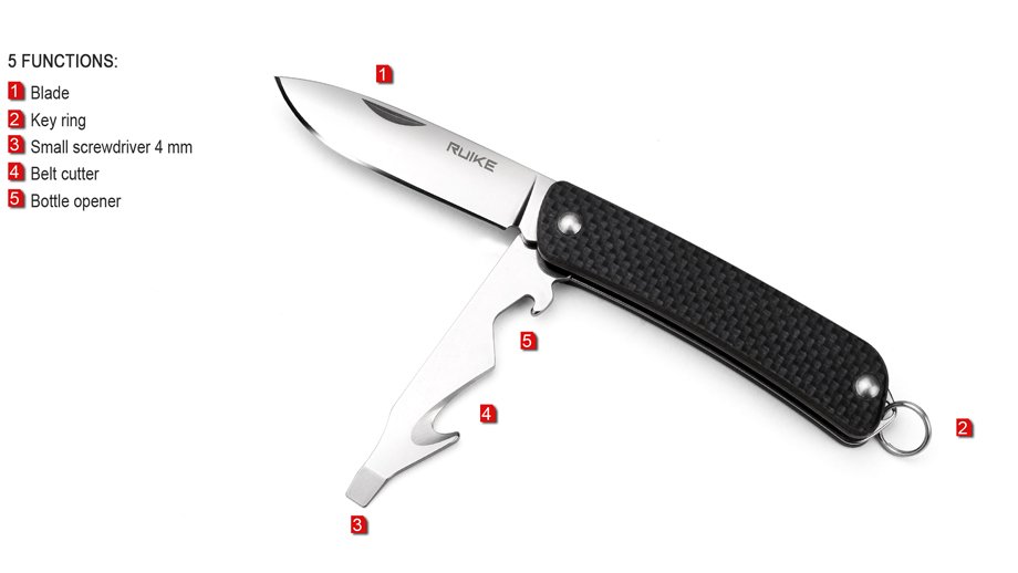 Das Ruike S21-G ist ein praktisches Schlüsselbundmesser. Die 5,3 cm lange polierte Klinge des Ruike S21-G aus Sandvik 12C27 Edelstahl weist eine erweiterte Stärke und Breite auf und erreicht so eine längere Lebensdauer und vielseitigere Einsatzmöglichkeiten. Zusätzlich verfügt es über eine Multifunktionsklinge mit Flaschenöffner, Schneidhaken und Schraubendreher. Der Griff aus schwarzem strukturiertem G10 liegt sicher und angenehm in der Hand und ist ideal für eine jahrelange Benutzung. Geöffnet wird das Ruike S21-G Taschenmesser per Nagelhau und gehalten wird es mithilfe eines Slipjoints. Mit Öse, Schlüsselring und Tip-down Clip.
