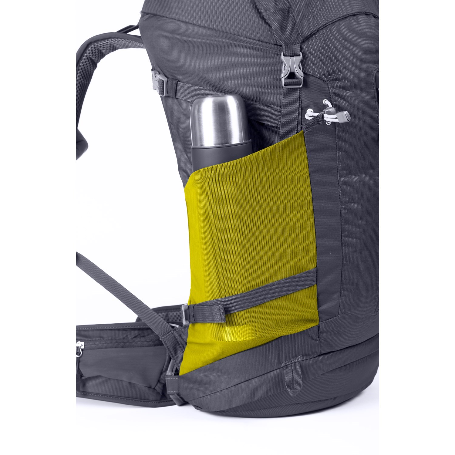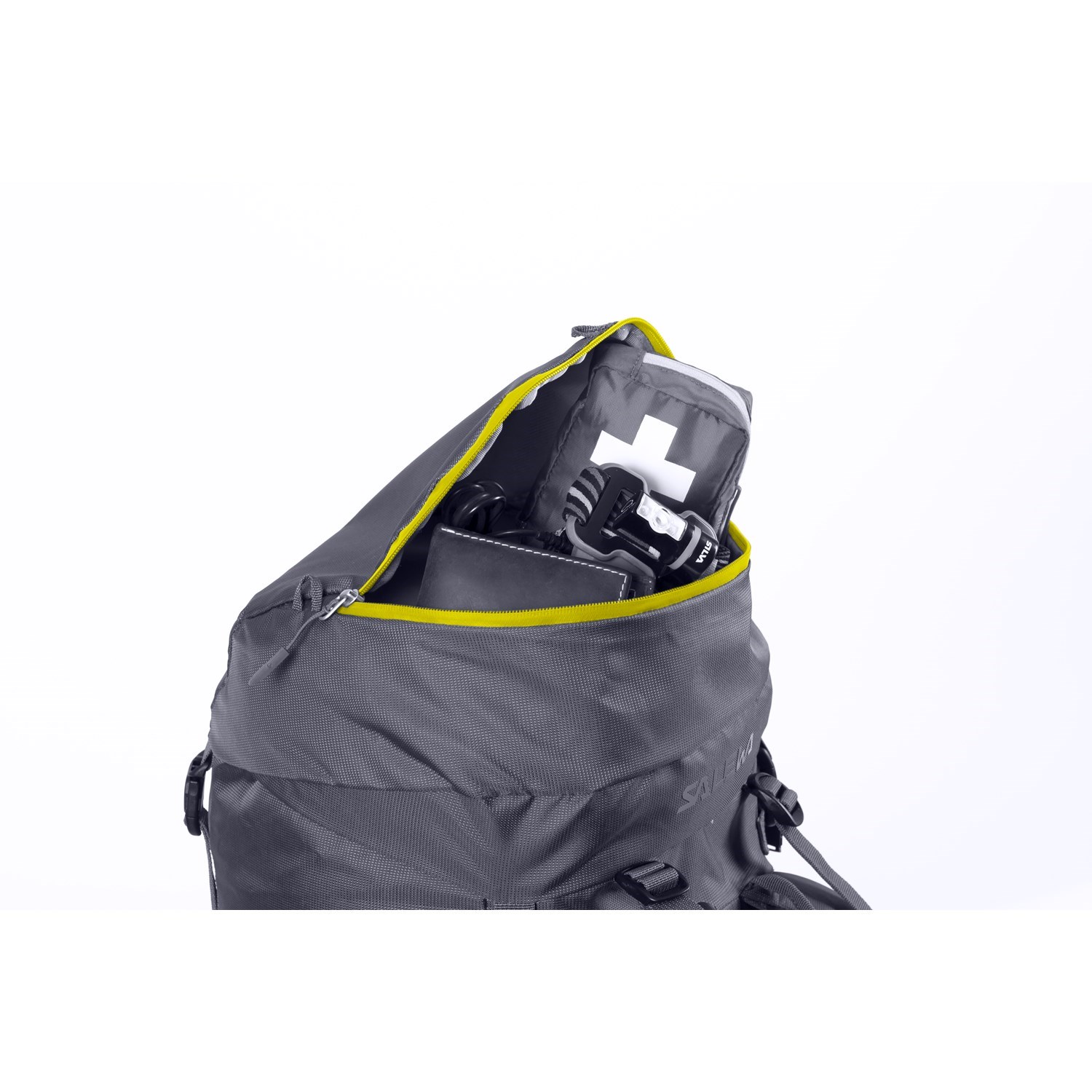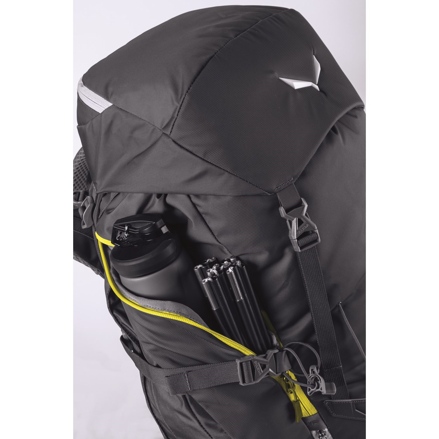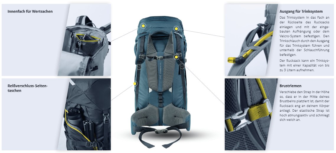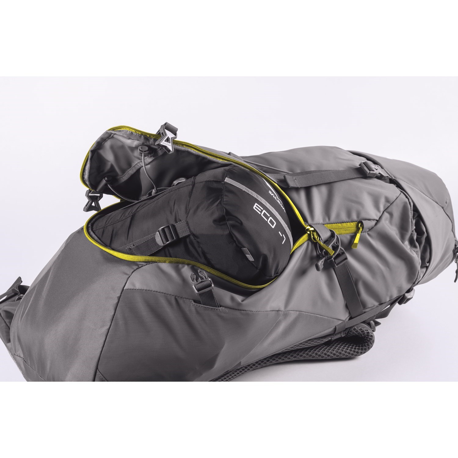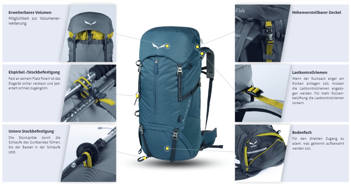 Mit Ausgang fürs Trinksytem, Eispickel-/Stockbefestigung, Seilhalterung, Lastkontroll- und seitlichen Kompressionsriemen sowie der Möglichkeit zum Verstauen von zusätzlichem Gepäck (10 Liter Volumen) unter dem abnehmbaren, höhenverstellbaren Deckel.