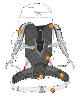 Die Konstruktion des Y1-Systems mit speziell angeordneten Stäben (1) sorgt für ein hervorragendes Verhältnis von effizienter Lastübertragung und gleichzeitiger Flexibilität. Der ergonomisch ausgeformte Hüftgurt mit Lendenpolster (2) und konisch geschnittenen Hüftügeln (3) ist bequem gepolstert und verhindert ein Verrutschen des Rucksacks. Die Lastkontrollriemen (4) , die komfortablen Schultergurte (5) und der Hüftgurt (6) sind verstellbar und erlauben eine passgenaue Einstellung.