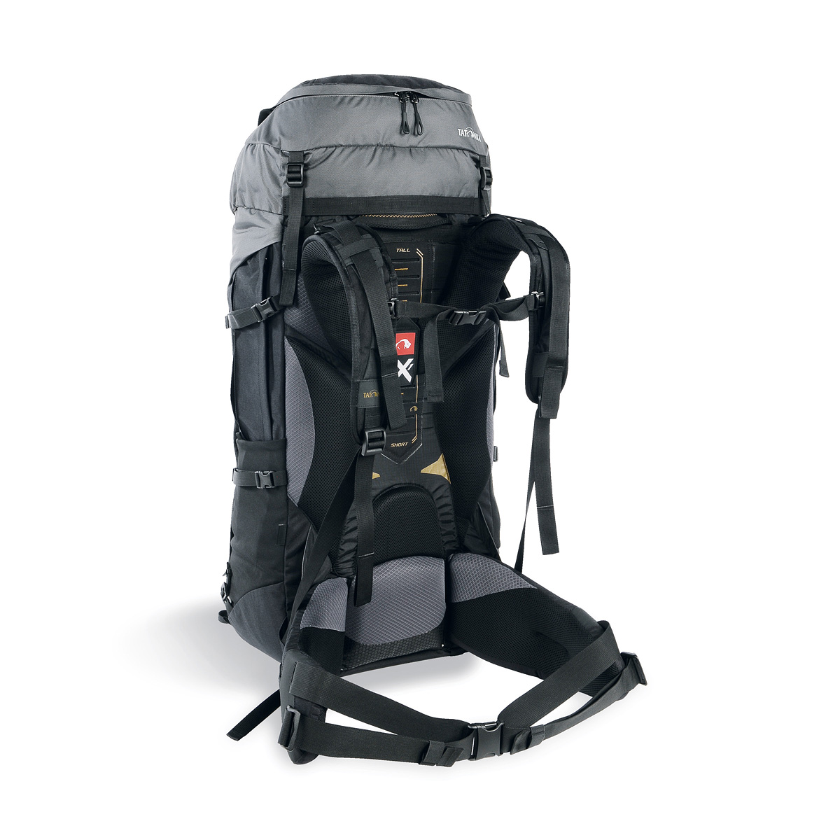 Durch die spezielle x-förmige Konstruktion (1) wird ein Teil der Tragelast seitlich in den gepolsterten Hüftgurt (2) geleitet und die Packlast so vom Rücken auf die Hüfte verlagert. Das zu tragende Gewicht kann dadurch über deutlich längere Strecken hinweg befördert werden. Der anatomisch anliegende und sehr bequeme Hüftgurt, die Lastkontrollriemen (3) und die weichen, ergonomischen Schultergurte (4) lassen sich leicht verstellen und ermöglichen so eine passgenaue und individuelle Einstellung des Tragesystems. Ein gummierter Einsatz auf dem Lendenpolster (5) und die darüberliegende, extrakonkav ausgeformte Rückenpolsterung (6) sorgen für Halt und perfekten Sitz.
