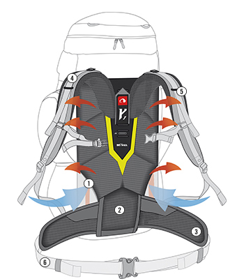 Die Konstruktion des Y1-Systems mit speziell angeordneten Stäben (1) sorgt für ein hervorragendes Verhältnis von effizienter Lastübertragung und gleichzeitiger Flexibilität. Der ergonomisch ausgeformte Hüftgurt mit Lendenpolster (2) und konisch geschnittenen Hüftügeln (3) ist bequem gepolstert und verhindert ein Verrutschen des Rucksacks. Die Lastkontrollriemen (4) , die komfortablen Schultergurte (5) und der Hüftgurt (6) sind verstellbar und erlauben eine passgenaue Einstellung. Beim Rucksack Damen Y1-System sind die Rückenlänge und die Schultergurte an die weibliche Anatomie angepasst.
