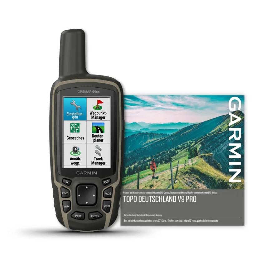 Das Paket besteht aus dem Garmin GPSMap 64sx und der Garmin Topo Deutschland v9 (Achtung: es ist KEINE DVD im Lieferumfang). Details und weitergehende Informationen zum Garmin GPSMap 64sx und der Garmin Topo Deutschland v9 finden Sie hier: