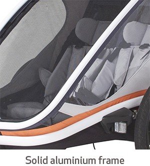 Der Anhänger lässt sich problemlos zusammenfalten und transportieren und eignet sich für verschiedenste Einsatzmöglichkeiten in unterschiedlichstem Gelände. Die einstellbare Radaufhängung verschafft den Kindern eine ruhige und gleichmäßige Fahrt. Der Outback ist gemäß EN 15918 und EN 1888 zertifiziert.