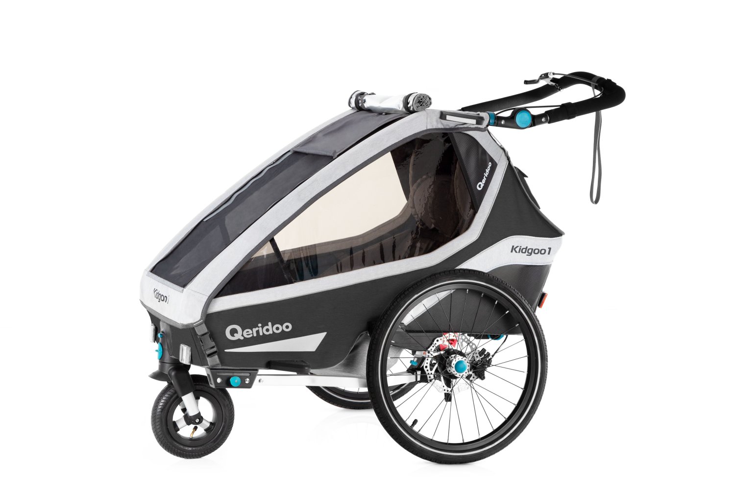 Qeridoo KidGoo 1 Pro Q8P-20-d dunkelgrau - Kinderfahrradanhänger mit Federung, Scheibenbremse, Joggerrad und Buggyrad