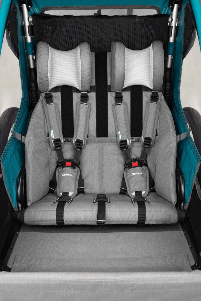 Der Qeridoo Sportrex2 ist voll gefederter Kinderfahrradanhänger für 2 Kinder. Der Qeridoo Sportrex2 zeichnet sich besonders durch seine sportliche Optik und tolle Aerodynamik aus. Er bietet ein gutes Preis-Leistungs-Verhältnis und bringt zusätzliche Komfortfunktionen mit. Die Kopfstützen des Qeridoo Sportrex2 sind bereits im Lieferumfang enthalten und sorgen für eine komfortable Haltung des Kopfes. Aufgrund seiner schmalen Durchfahrtsbreite ist der Kinderfahrradanhänger auch als Buggy optimal nutzbar. Der Qeridoo Sportrex2 ist mit einem innovativen Blattfeder-Dämpfersystem ausgestattet, das auch in unebenem Gelände für eine sehr gute Schockabsorbierung sorgt.