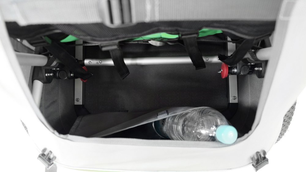 - Fahrraddeichsel, der beim Bedarf nach unten geklappt werden kann, und Kupplung (Fahrradanhänger bleibt stehen, wenn das Fahrrad umfällt) sind im Lieferumfang enthalten
