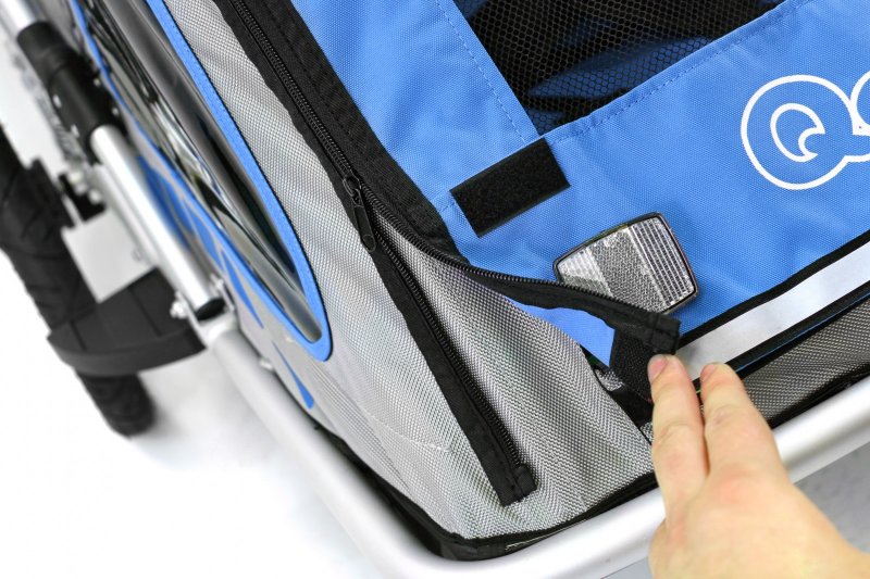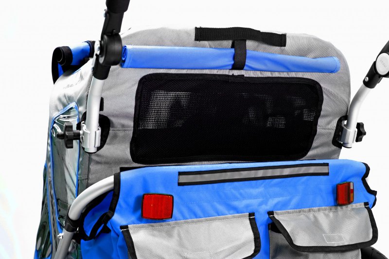 - Fahrraddeichsel, der beim Bedarf nach unten geklappt werden kann, und Kupplung (Fahrradanhänger bleibt stehen, wenn das Fahrrad umfällt) sind im Lieferumfang enthalten
