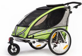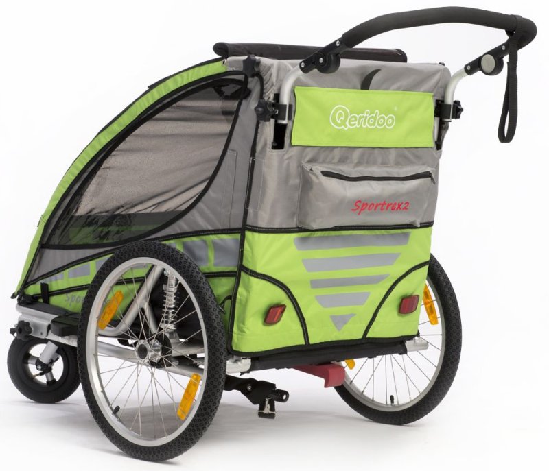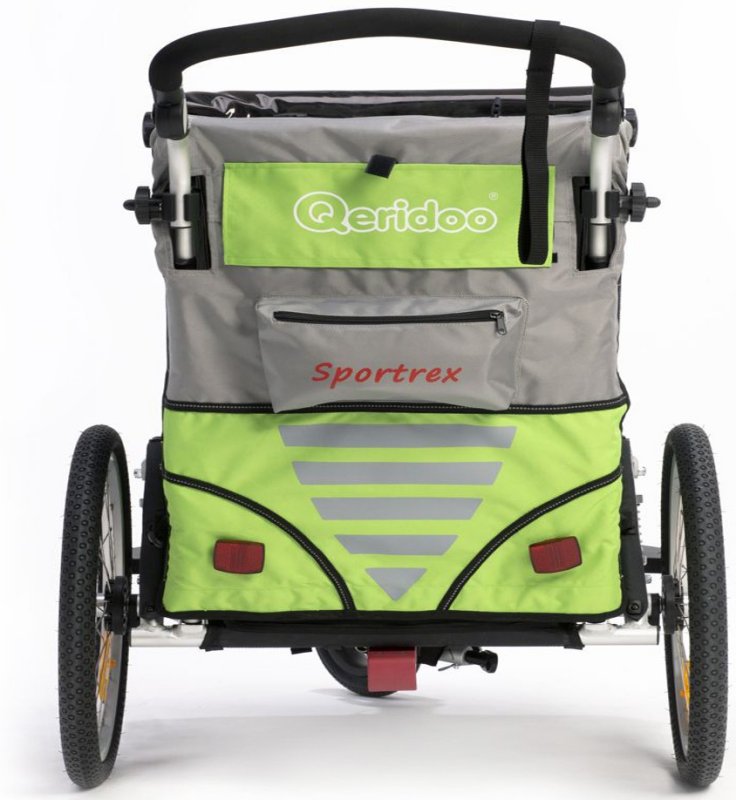 Der Qeridoo Sportrex2 2016 ist ein Kinderfahrradanhänger für zwei Kinder. Der Anhänger ist mit einer einstellbaren Sprungfederung und Feststellbremse ausgestattet. Die Fahrradkupplung und ein Buggyrad mit Jogger-Funktion gehören zum Lieferumfang. Das FX- Klappsystem ermöglicht ein einfaches Zusammenfalten des Qeridoo Sportrex2 2016 mit nur einer Handbewegung. Den leichten und sicheren Qeridoo Sportrex2 2016 kann man dank des großen Lieferumfangs als Babyjogger, Kinderwagen oder Fahrradanhänger nutzen.