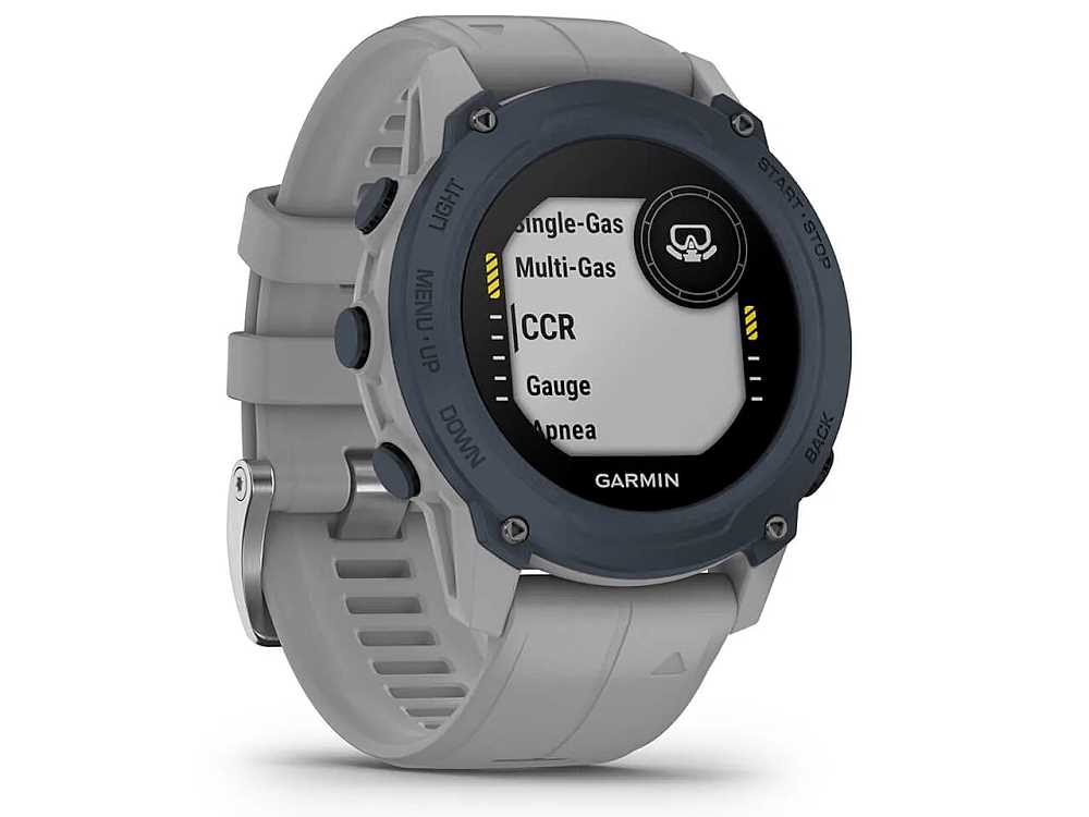 Garmin Descent G1, (010-02604-11), Tauch Smartwatch blaue Lünette mit hellgrauem Silikon Armband