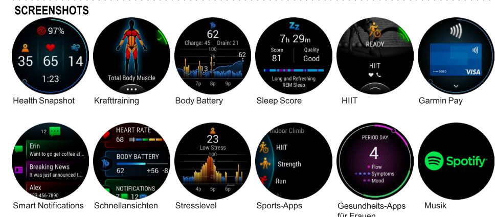 HEALTH SNAPSHOT: Erfasse in einer 2 minütigen Aktivität deine Herzfrequenz, HF-Variabilität, Pulse Ox, Atemfrequenz, sowie Stresslevel, und erhalte dazu einen Bericht in Garmin Connect auf deinem kompatiblen Smartphone