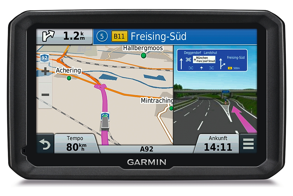 - LKW- spezifische Warnungen, z. B. für scharfe Kurven, Brückenhöhen und Gewichtsbeschränkungen