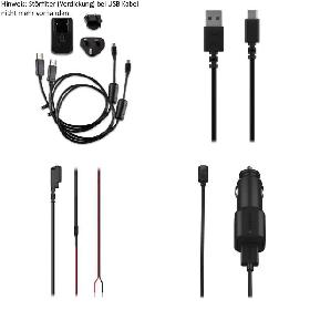 Das Garmin Ladeset (010-11478-05) umfasst ein Netzteil, microUSB sowie ein miniUSB Kabel die zum aufladen / betreiben Ihres Garmin zumo XT2 verwendet werden. Schließen Sie das entsprechende Kabel an Ihr Garmin zumo XT2 an um Ihr Gerät mit Energie zu versorgen. Zusätzlich können Sie das USB Kabel auch zur Datenübertragung am PC verwenden.