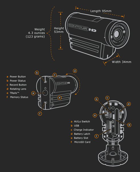 Verbessert wurde der Farbabgleich genauso wie die Blende der Kamera. Bei Aufnahmen werden nun die satten Farben erhalten, schneller Lichtwechsel wird automatisch korrigiert. Gestochen scharfe und kristallklare Bilder sind garantiert. Die Linse selbst bleibt drehbar und bietet ebenso einen Weitwinkel von 135° bei Full HD Auflösung. Weiterhin enthalten ist das Dual-Lasersystem. Mit dessen Hilfe kann einfach geprüft werden, wohin genau die Kamera gerichtet ist und ob das Bild waagrecht ist. Zur Korrektur kann der vordere Aufsatz mit Linse gedreht werden. Die Aufnahme erfolgt auf eine bis zu 16 GB große MicroSD Karte. Dies macht es möglich bis zu 3,5 Stunden in Full HD aufzunehmen, und das ganz einfach über den Schuber an der Oberseite der Kamera. Versorgt wird das System durch einen Akku der beliebig oft wieder aufgeladen werden kann und eine Haltbarkeit von ca. 3 Stunden unter voller Last aufweist.