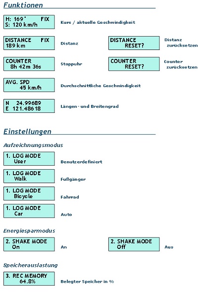 Der WPL-1000 zeigt Ihnen über das LCD-Display Informationen über den Kurs, aktueller und durchschnittlicher Geschwindigkeit, Distanz, Stoppuhr sowie Ihre Position in Längen und Breitengrad. Des Weiteren können Sie unterwegs Einstellungen des Aufzeichnungsmodus vornehmen und so zwischen Benutzerdefiniert, Fußgänger, Fahrrad, und Auto jederzeit wählen. Der "Shake Mode" stellt bei Aktivierung einen Energiesparmodus dar, womit Sie noch mehr als 15 Stunden Dauerbetrieb erzielen können. Außerdem haben Sie eine Anzeige über die Speicherauslastung sowie den Batteriestatus. Hier sehen Sie die ganze Menüstruktur des WPL-1000 mit Funktionen sowie Einstellungsmöglichkeiten: