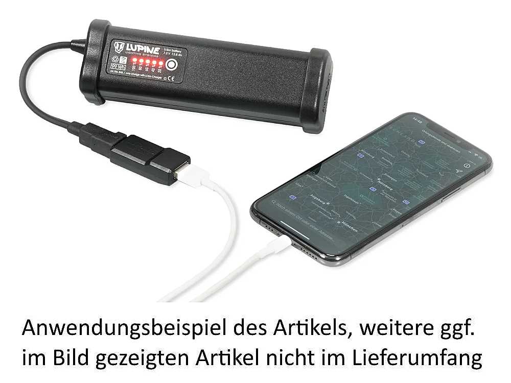 Wer kennt nicht das Problem, man ist unterwegs beim Radfahren, einer Wanderung oder einer längeren Zugfahrt und der Akku des Smartphones ist bereits nach wenigen Stunden leer. Mit dem Lupine USB One (d444) Adapter verwenden Sie einen Lupine Akku zum laden des Smartphones. Mit einem Ladestrom von bis zu 1.5A geht das laden dazu noch schnell.