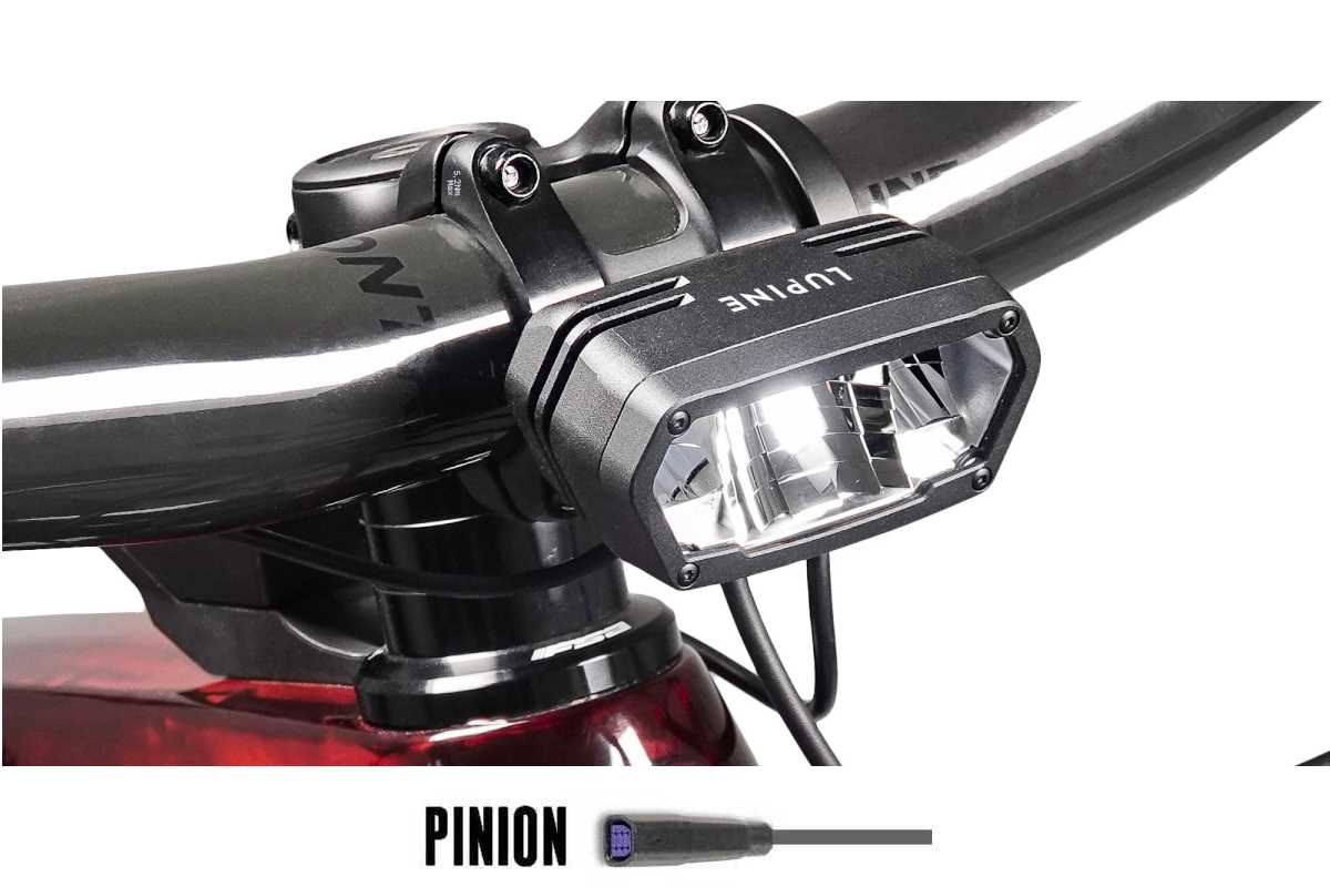 Lampenset Lupine SL Minimax F - E-Bike Frontlicht mit 2100 Lumen Fernlicht, Lenkerhalter 31.8mm für E-Bikes mit Pinion Motor. Das Frontlicht wird mit dem beiliegenden Anschlusskabel am Pinion Motor Ihres E-Bikes angeschlossen. Die Schaltung Abblend-/ Fernlicht erfolgt über die mitgelieferte kabelgebundene Fernbedienung direkt am Lenker. Diese Version der Lupine SL Minimax F ist u.a. passend für Pinion MGU Motoren. Um die Lupine SL Minimax F zu nutzen sollte der E-Bike Motor mindestens 17W-22W bereitstellen können. Lieferumfang: Lupine SL Minimax F, Anschlusskabel Pinion, Lenkerhalter 31.8mm, kabelgebundene Fernbedienung 31 cm.