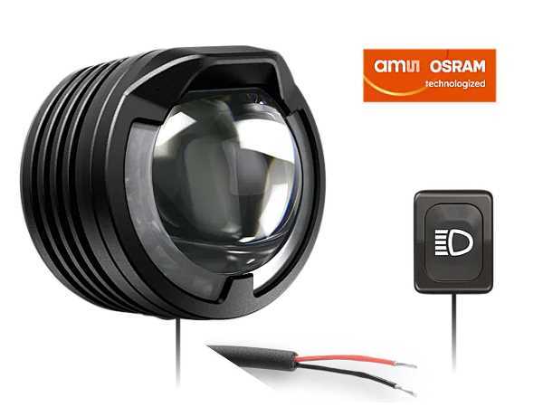 Die Fernbedienung wird neben dem rechten Lenkergriff in Reichweite des Daumens montiert. Das Scheinwerfersymbol zeigt dabei nach links. Der Taster leuchtet nicht: Die Lampe ist aus oder die Tagfahrlichtfunktion ist aktiviert; der Taster leuchtet grün: das Abblendlicht ist aktiviert; der Taster leuchtet blau: die Fernlichtfunktion ist aktiviert. Einschalten: Einschalten der Lampe an der Fernbedienung. Ausschalten: Durch längeren Tastendruck schaltet sich die Lampe aus. Leuchtprogramme: Der Helligkeitssensor ist aktiviert und schaltet automatisch zwischen Tagfahrmodus und Abblendlicht um. Hinweis: In manchen Fällen ist für den Betrieb der Lampe am E-Bike die Freischaltung des Lichtausgangs am Bike durch einen Fahrrad Händler erforderlich.