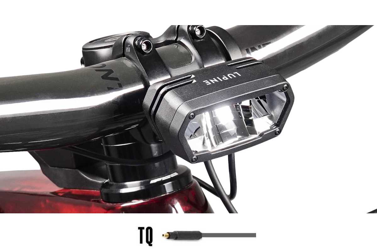 Lampenset Lupine SL Minimax F - E-Bike Frontlicht mit 2100 Lumen Fernlicht, Lenkerhalter 31.8mm für E-Bikes mit TQ Motor. Das Frontlicht wird mit dem beiliegenden Anschlusskabel am TQ Motor Ihres E-Bikes angeschlossen. Die Schaltung Abblend-/ Fernlicht erfolgt über die mitgelieferte kabelgebundene Fernbedienung direkt am Lenker. Diese Version der Lupine SL Minimax F ist u.a. passend für TQ HPR 120S, HPR 50 Motoren. Um die Lupine SL Minimax F zu nutzen sollte der E-Bike Motor mindestens 17W-22W bereitstellen können. Lieferumfang: Lupine SL Minimax F, Anschlusskabel TQ, Lenkerhalter 31.8mm, kabelgebundene Fernbedienung 31 cm.