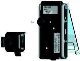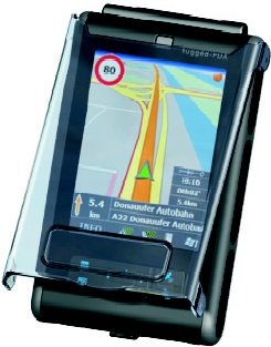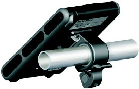 Die Fahrradhalterung kann auf die Rückseite des PDA montiert werden und ist zur Befestigung an nahezu jedem Fahrradlenker geeignet. Durch das Umlegen eines Hebels lässt sich der PDA schnell anbringen und auch vom Lenker abnehmen. Am PDA verbleibt nur eine kleine Basisplatte. |
