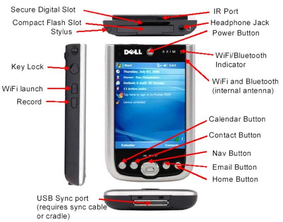 - Dell Axim X51v Wireless (inkl. WLAN und Bluetooth), VGA Display, 624MHz, 64 MB RAM, 256 MB ROM, Deutsch