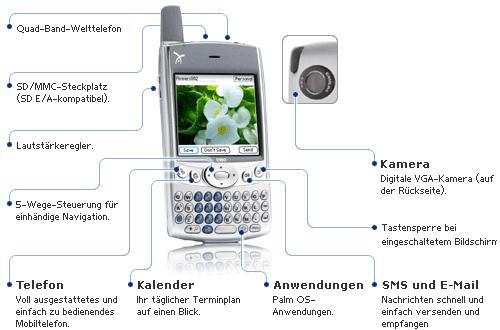 Erledigen Sie alle Aufgaben mit nur einem Gerät. Der Treo 600 ist ein voll ausgestattetes Mobiltelefon, ein Palm OS-Organizer, mit SMS, E-Mail, Webbrowser sowie eine Digitalkamera in einem einzigen Gerät. Dabei ist das Gerät so klein, dass es in Ihre Jackentasche passt.